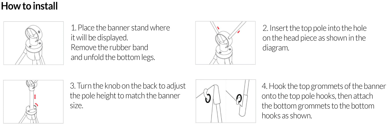 Designed to hold 24-inch wide banners, adjustable from 5.2 ft to 6 ft tall, perfect for indoor use at events, shops, or lobbies.